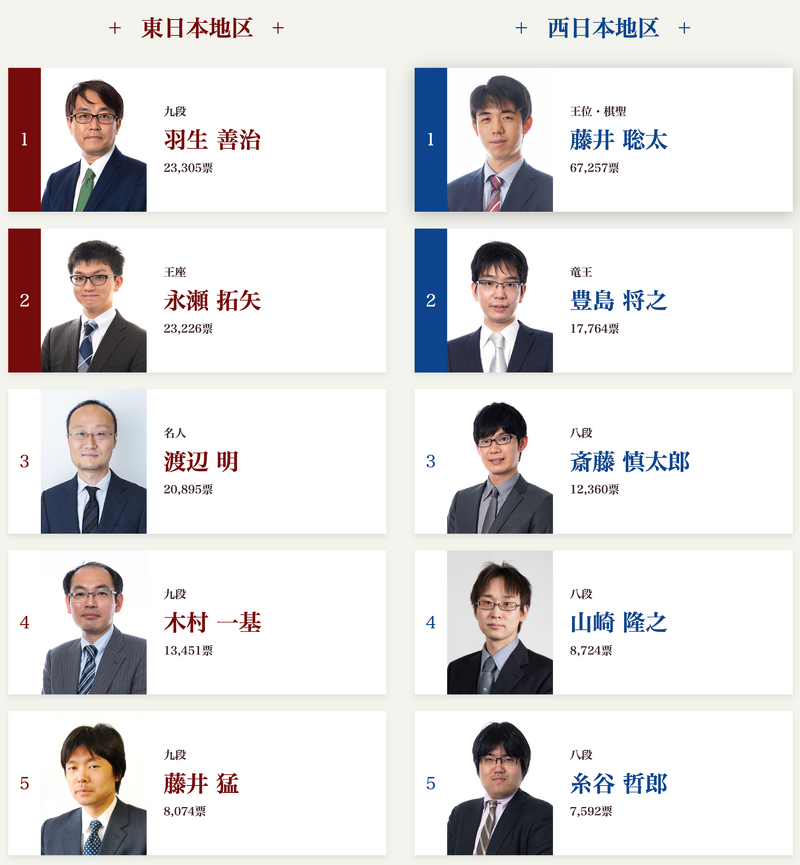 お知らせ 2021年09月02日 投票結果発表!(2021年) SUNTORY将棋オールスター東西対抗戦2021ファン投票の結果発表を本日17時にいたしました。中間発表と同様、東西TOP5を掲出しております。こちらで選出された東西TOP2の棋士は、予選免除となり、決勝戦からの出場となります。 お知らせ一覧に戻る
